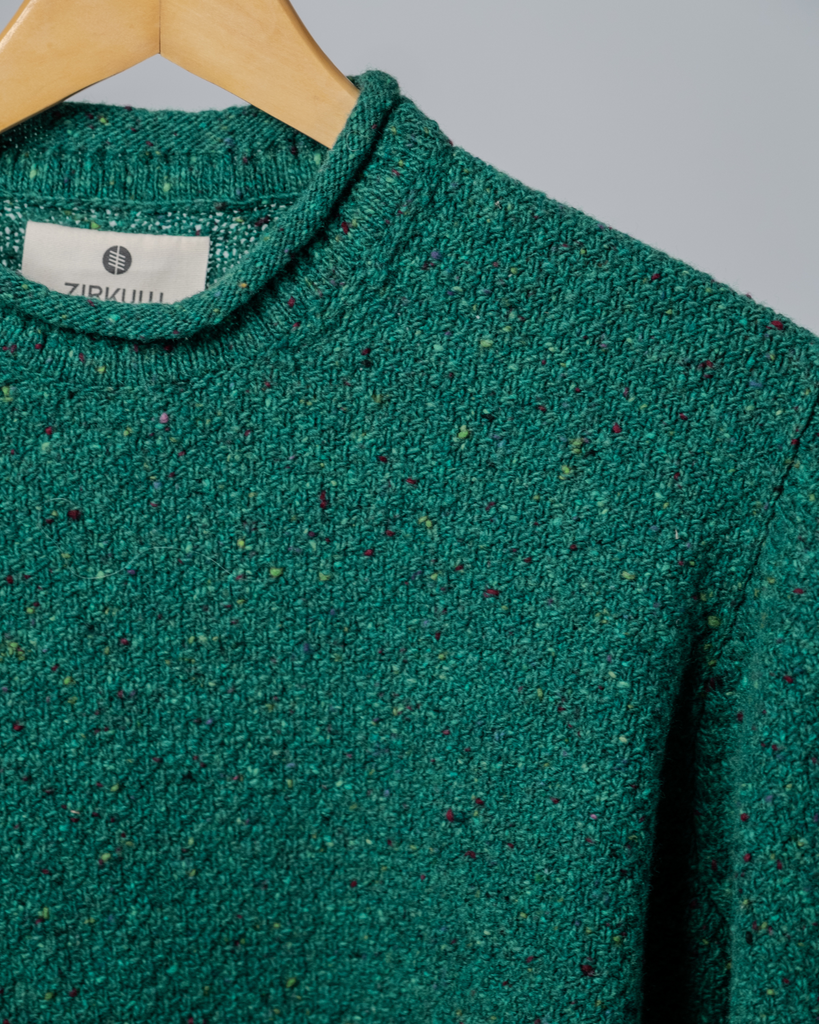 - Traditional Irish fisherman rolled collar, hem, and cuffs